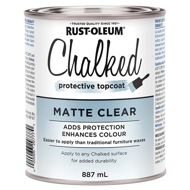 Rust-Oleum(R) Chalked Protective Topcoat is a clear coating that is applied over Chalked Ultra Matte Paint. It adds protection and durability, while enhancing colour. Easier to apply than traditional furniture waxes. Apply to any chalked surface for added durability. Does not need to be reapplied. Indoor use only.