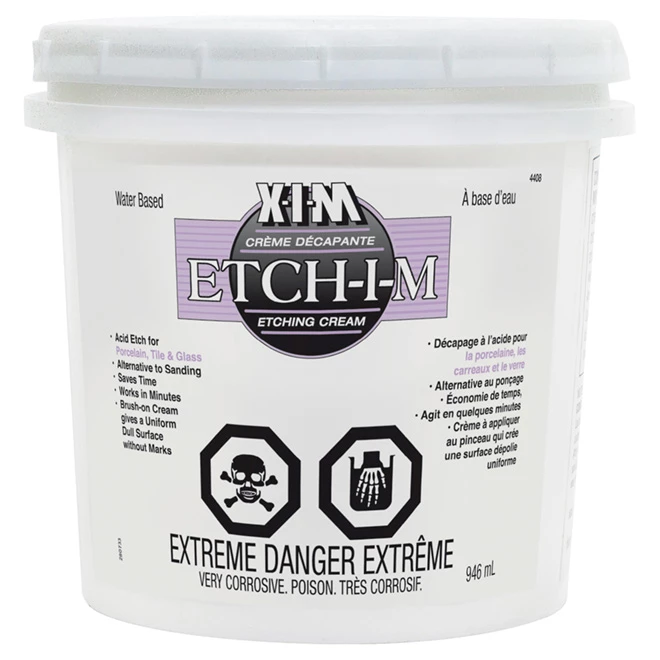 Water based etching cream for porcelain tile and glass. Great alternative to sanding allowing to save time. Works in minutes. 946 mL.