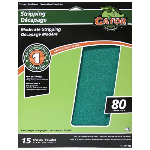 Use this 15 pack of Gator sandpaper sheets for stripping paint and preparing surfaces. The anti-build surface of the aluminum oxide sandpaper stops dust and particles from accumulating to simplify sanding jobs. Remove paints and polyurethane lacquers with this premium 80-grit sandpaper.