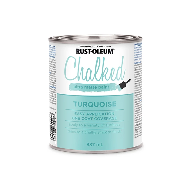 With Rust-Oleum(R) chalked paint, you can give an aged look to wood furniture and even create a distressed look using two different colours. Chalked paint creates a smooth, ultra matte finish in a couple of coats. A gorgeous velvety, chalky finish can be created using a synthetic brush and lightly feathering the paint as it is applied. Finish your project with a Rust-Oleum(R) chalked protective topcoat. Rejuvenate furniture and even paint your kitchen cabinets for a whole new look. Turquoise. 887 ml