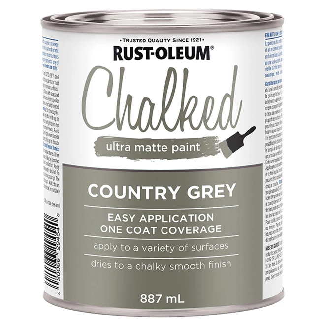 Rust-Oleum(R) Chalked Ultra Matte Paint creates an ultra-matte finish with superior adhesion and coverage. It rejuvenates furniture and home décor with timeless elegance. It can be painted or distressed, giving any project a one of a kind look with a vintage feel. Easy application, one coat coverage. Applies to a variety of surfaces. Dries to a velvety smooth finish. Indoor use only. Country Grey. 887 ml