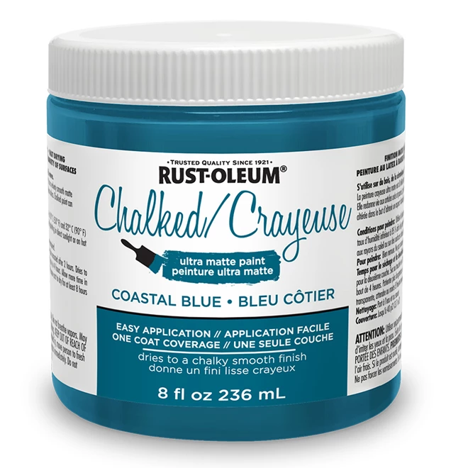 With Rust-Oleum(R) chalked paint, you can give an aged look to wood furniture and even create a distressed look using two different colours. Chalked paint creates a smooth, ultra matte finish in a couple of coats. A gorgeous velvety, chalky finish can be created using a synthetic brush and lightly feathering the paint as it is applied. Finish your project with a Rust-Oleum(R) chalked protective topcoat. Rejuvenate furniture and even paint your kitchen cabinets for a whole new look. Coastal Blue colour. Container size: 236 ml.